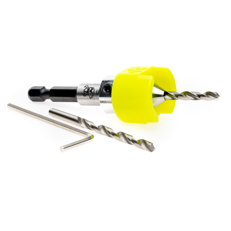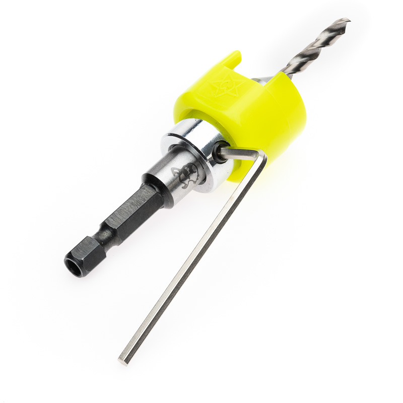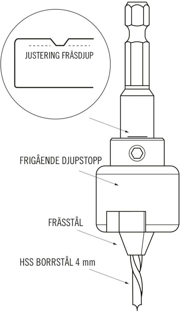 Borrförsänkarens frässtål är i en hög kvalitet som kan slipas flera gånger. Verktyget levereras med två stycken 4 mm HSS borrstål och en sexkantnyckel för justering av fräsdjupet.