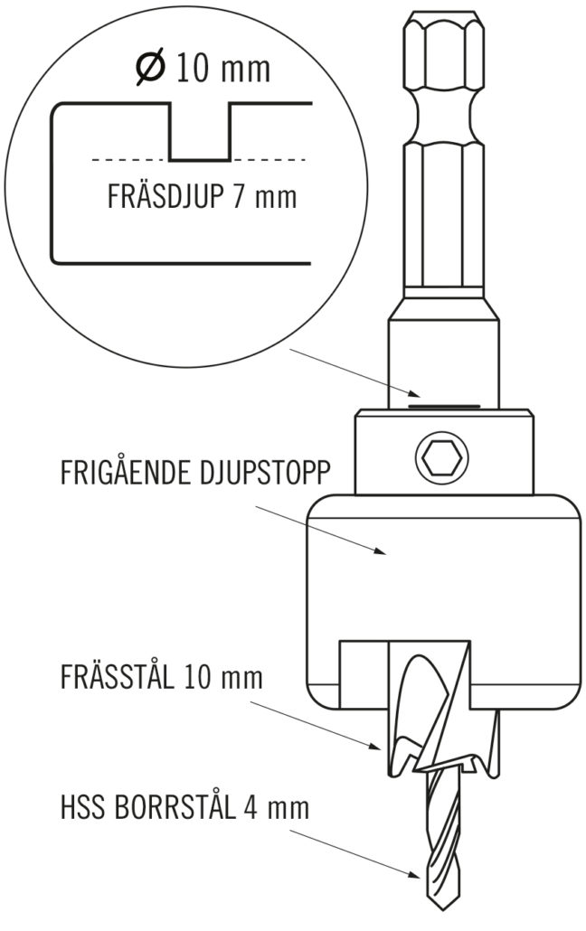 Borrförsänkarens frässtål är i en hög kvalitet som kan slipas flera gånger. Verktyget levereras med två stycken 4 mm HSS borrstål och en sexkantnyckel för justering av fräsdjupet.