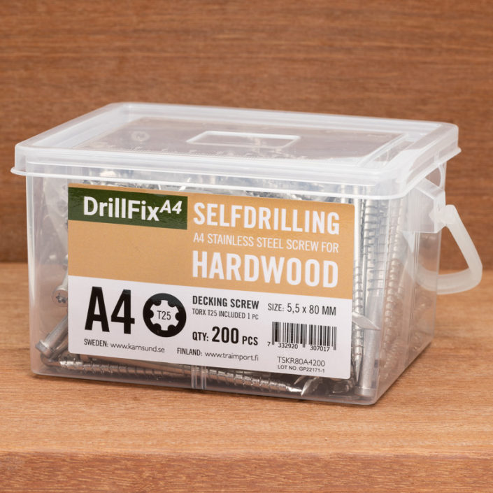 DrillFix A4 självborrande trallskruv levereras i en konsumentvänlig förpackning om 200 skruv, och finns i dimensionen 5,5×65 mm för 21 mm trall och 5,5×80 mm för 28 mm trall.