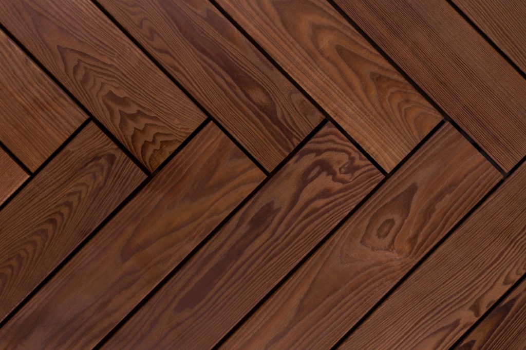 Herringbone från Thermory® är en prefabricerad trallmodul i värmebehandlad Ask som läggs i ett fiskbensmönster.